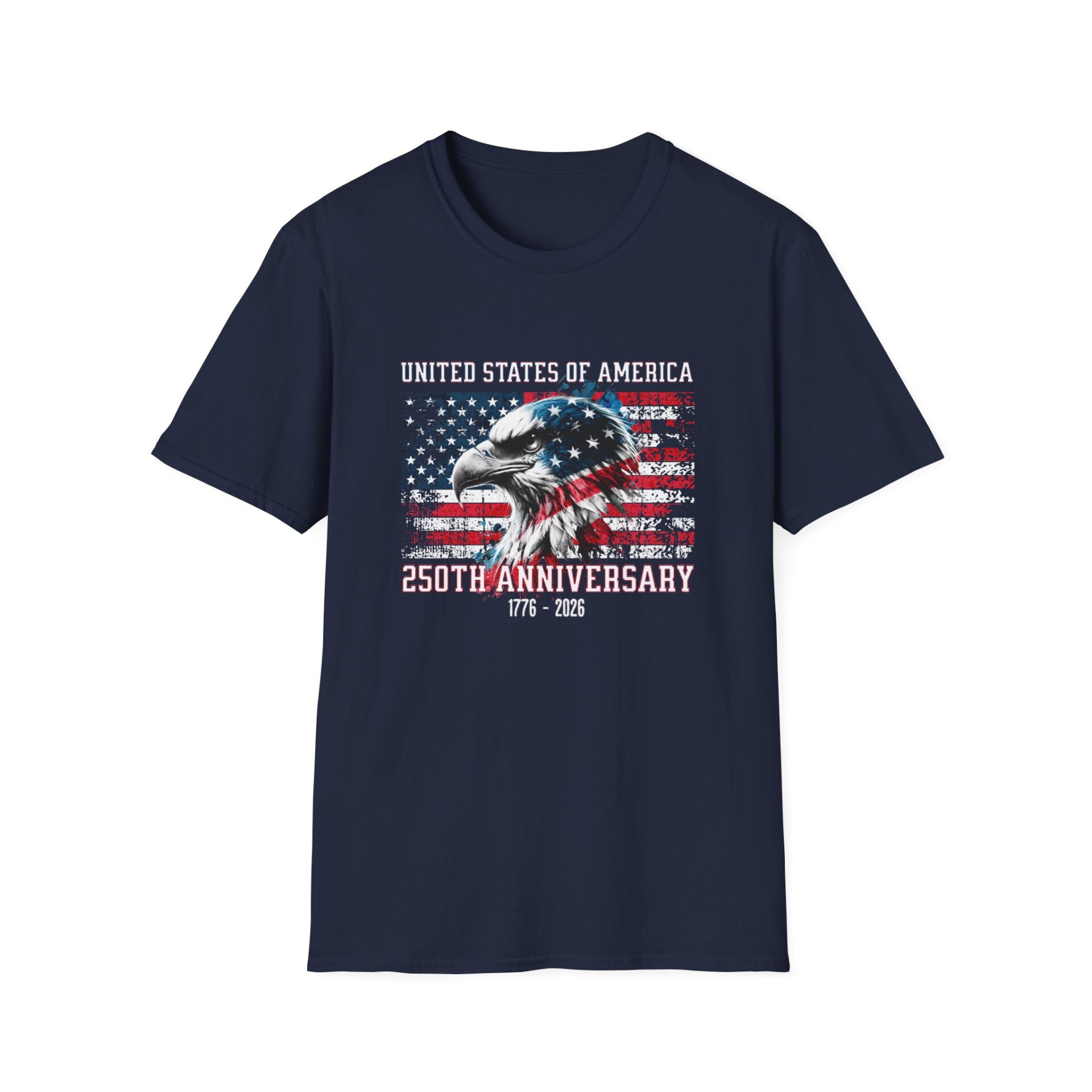 This lightweight cotton tee carries a quiet, rugged pride. A distressed American flag and soaring bald eagle form a nostalgic graphic that reads “United States of America — 250th Anniversary.” It feels lived-in right away: soft to the touch, breathable, and cut with a classic crew silhouette that layers easily under a jacket or wears alone. The print’s vintage fade works with the shirt’s smooth knit, giving it an authentic, slightly weathered look that complements everyday wear. Reach for this shirt when you want to honor history without shouting — a dependable piece for parades, backyard cookouts, or casual days when comfort and subtle patriotism matter.